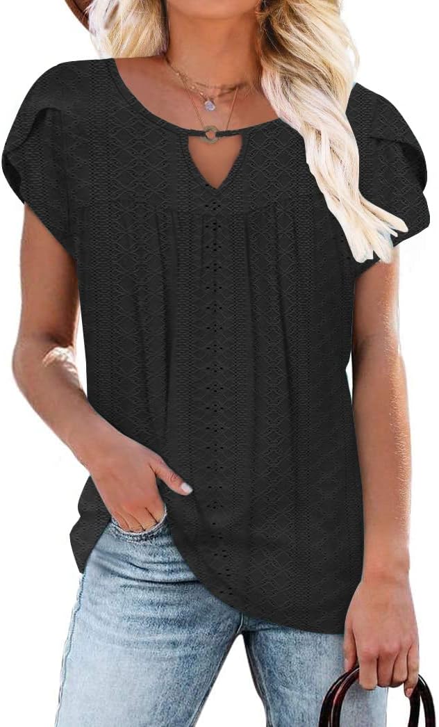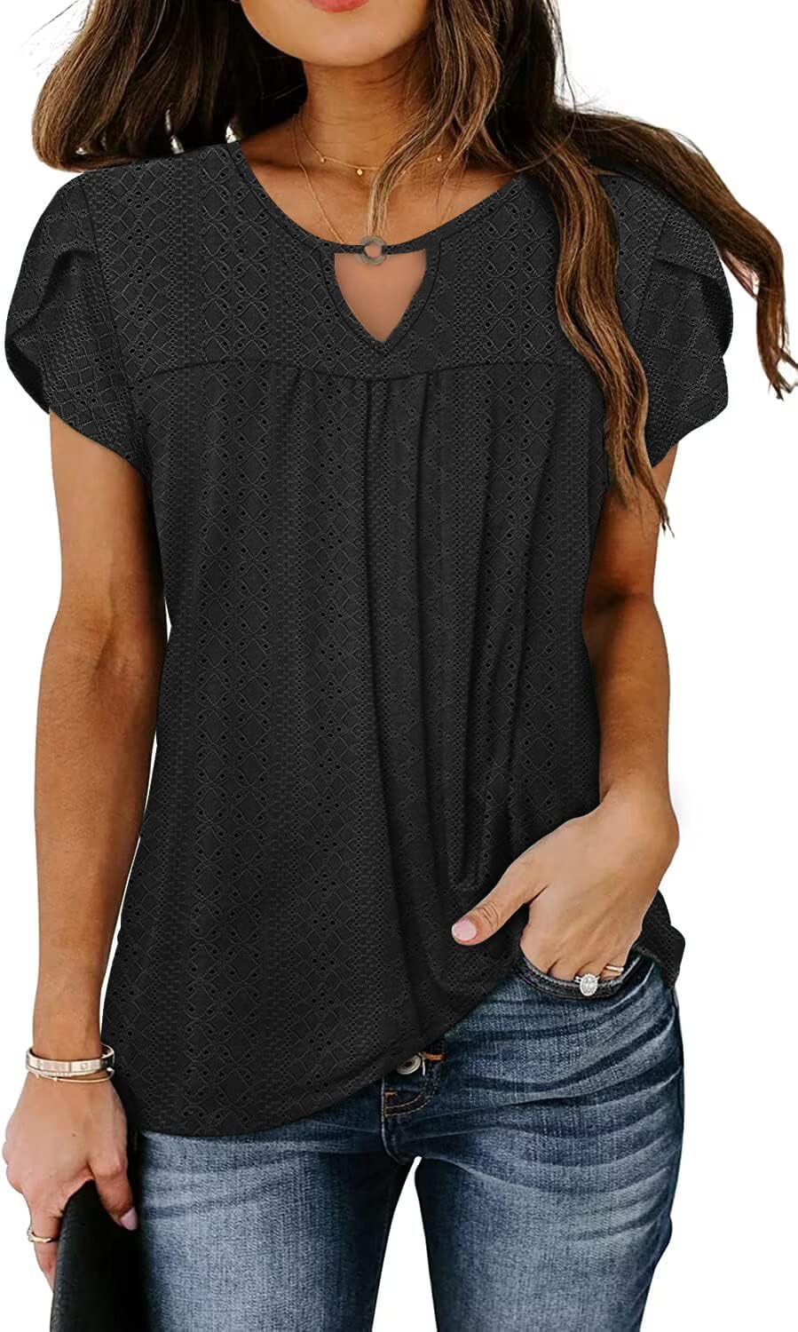 - Feature: Classic crew neck,cute key hole at the neck,fashion hollow out design, lovely petal sleeves, front pleated loose casual tunics that so flattering to hide the belly better